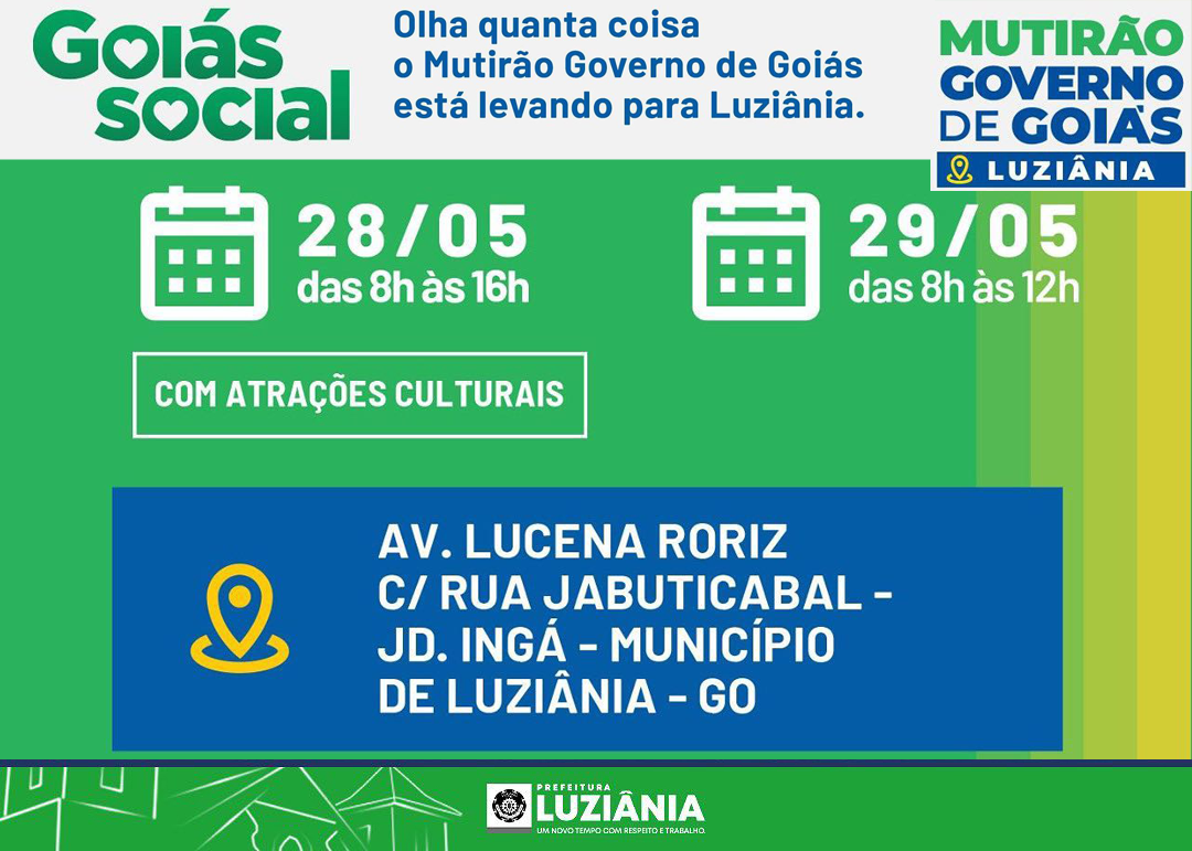 No sábado e domingo (28 e 29/05), a partir das 8h, na Avenida Lucena Roriz (próximo ao Supermercado Liderança), no Jardim Ingá. Nessa edição, serão entregues: Cartões do Aluguel Social, Cartões do Bolsa Estudo, CartõesGRANDE MUTIRÃO de serviços e benfeitorias realizado pelo Governo de Goiás em parceria com a Prefeitura de Luziânia.