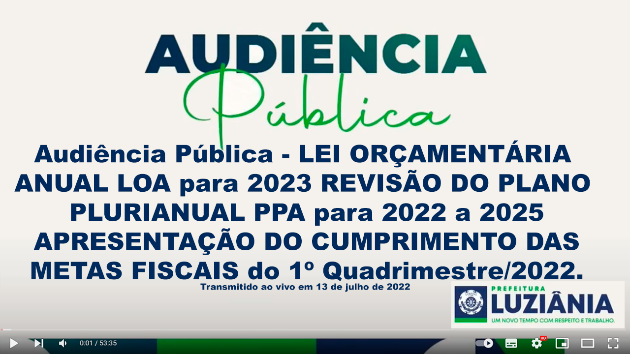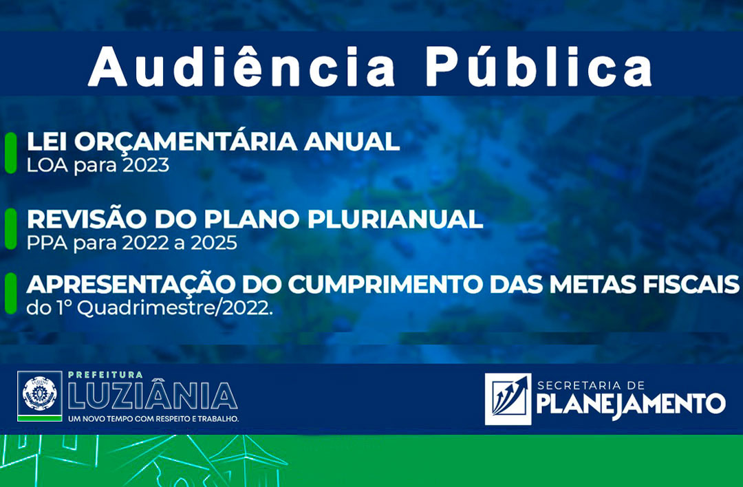 A Prefeitura Municipal de Luziânia, por meio da Secretaria de Planejamento, realizou nessa última quarta-feira(13), uma audiência pública apresentando a Lei Orçamentária Anual (LOA), para o exercício de 2023 com a revisão do plano plurianual do PPA para 2022-2025 e o cumprimento das metas fiscais do 1º quadrimestre/2022.