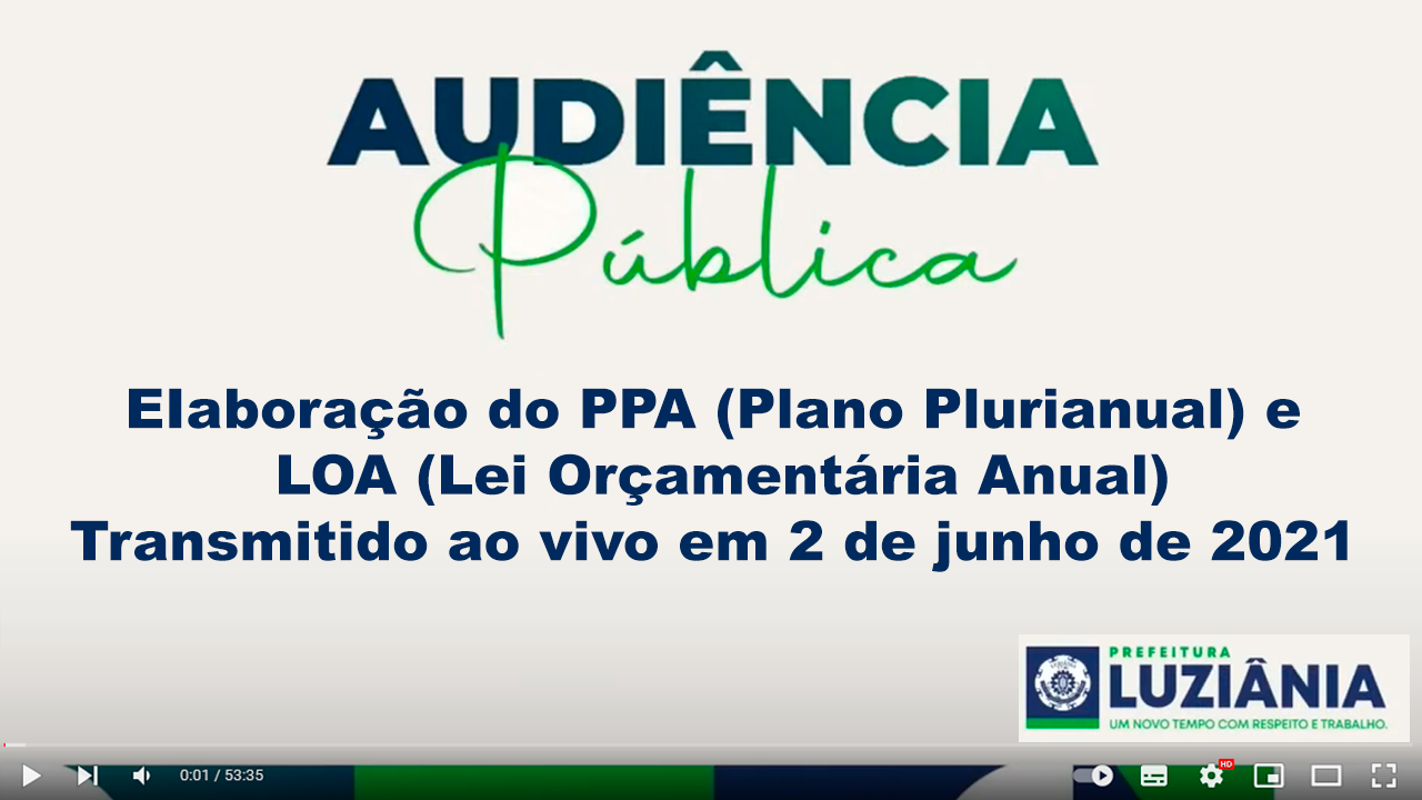 PLANO PLURIANUAL – ORÇAMENTO PARTICIPATIVO A Prefeitura de Luziânia convida toda a população para participar da 2º Audiências Públicas para a elaboração do seu Plano Plurianual – PPA, um momento essencial de escuta e diálogoCONVITE – AUDIÊNCIA PÚBLICA – PPA